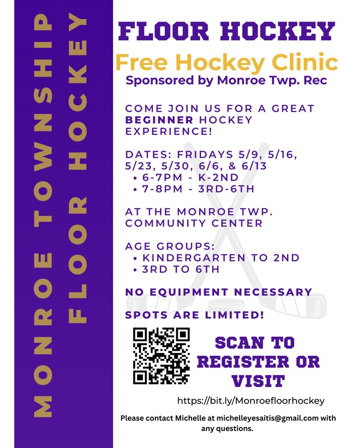 FREE indoor floor hockey clinics for elementary school age residents of Monroe Township! This clinic is geared towards athletes with little to no hockey experience who are interested in exploring the fabulous sport of hockey with zero barriers to entry.
